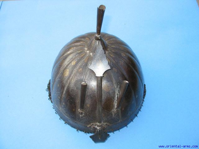 We offer here a nice 19C helmet from Rajasthan, India with gold koftgari decoration work. There are two plume holders and a movable nasal guard. There is also a mail collar to protect the neck and shoulders. Very good condition with some erased areas