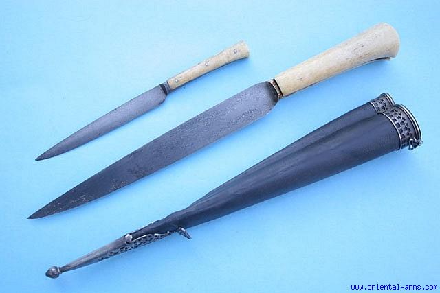 A very fine and unusual piece: Two kard knives in one scabbard. A real size one with a 9 inches blade and a smaller version with a 5 inches blade. Both blades are forged from fine wootz (Damascus) steel, of high contrast and clear pattern. Grips are walrus ivory. The grip strap and bolsters of the big knife is richly decorated with gold koftgary work. Both kards are housed in one sheath with two different compartments. The scabbard is covered with black leather and mounted with fine pierced silver locket and chape. Total length (In scabbard) 14 inches. Very good condition. The leather cover is later but the scabbard and silver fittings are original. A hairline crack on the right grip of the small knife. The silver work suggests central Indian work, Hyderabad area, early to mid 19 C. A very fine item. |