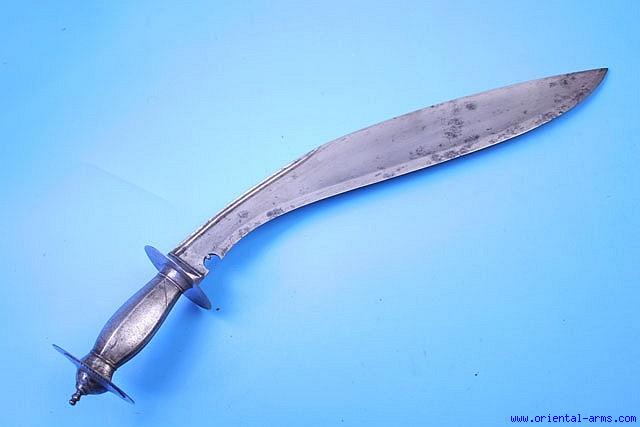 Up for sale id this fine hybrid of two famous Nepalese weapons: The Kora and the Khukuri. Here we have a massive khukuri blade, 16 inches long, with a good ridged spine and a whole steel Kora handle, made of central steel grip and disk pommel and cross guard. Total length 20 inches. Very good condition. No scabbard. This sword is coming from the collection of John Powell, SF, a world known collection of Nepalese and related weapons. |