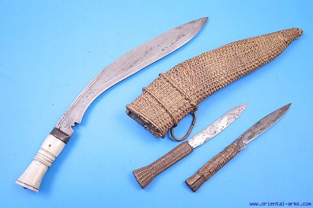 An unusual example of early 20 C. Khukuri, with good blade 12 inches long. The handle is bone and the scabbard is wood covered with braided rattan fibers. This Khukuri comes with two Karda knives with their handles also bound with braided rattan fibers. Total length16 inches. Very good condition. Some losses to the rattan binding on one of the kaerdas. Very attractive price. This Khukuri is coming from the collection of John Powell, SF, a world known collection of Nepalese and related weapons. |