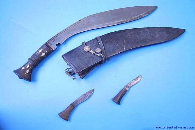 Up for sale is this big and heavy Khukuri knife, 16 inches blade, 21 inches total length. Wood handle with bone inserts and steel bolsters. Original leather covered scabbard with original side Chakma (steel) and Karda (knife). Very good condition. This Khukuri is coming from the collection of John Powell, SF, a world known collection of Nepalese and related weapons. |