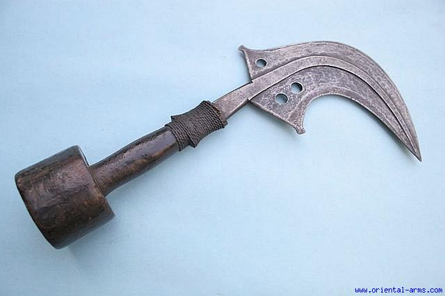 The knife of the Mangbetu people residing in Central Africa was originally used as a weapon of war and also as an agricultural implement, but later on developed into luxury item and a symbol of status. The one offered here for sale is an early 20 C. piece, sickle shaped. 8 inches (point to point) blade with a strong central rib. Wood handle bound at its top part with twisted iron wires. 14 inches total length (tip of blade to pommel). Very good condition. Original blackened color of the blade. |