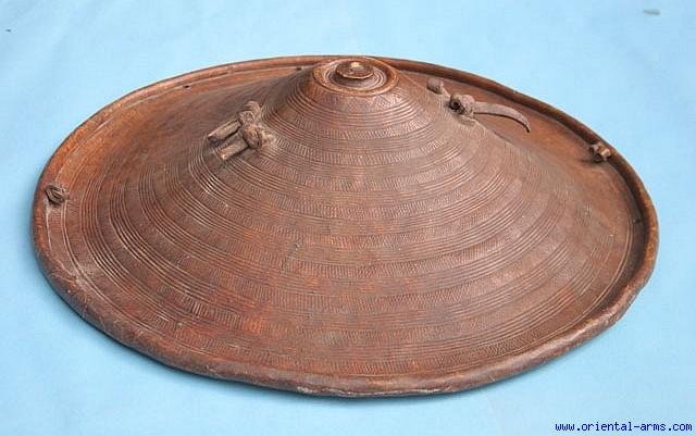 We offer here for sale a late 19 or early 20th Century war shield from Ethiopia. It is a conical shape, 21 inches in diameter and 7 inches tall, made of Buffalo (?) hide very nicely tooled with geometrical design. Excellent condition, all part complete and undamaged. Beautiful shining age patina. |