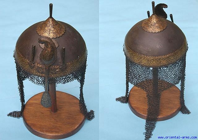 Up for sale is this very good Indian helmet, probably 18 C. Steel dome head, composed from two steel sectors. The central one is hard steel, probably wootz. The outer ring is softer steel made so to facilitate the scratches needed for the gold koftgari decoration all around. Diameter 8 inches, height 6 ½ inches. Styled nasal protector also with fine gold decoration. The collar mail is made of thousands of small rings, all riveted. Good condition. Few repairs on the steel dome. The mail collar is of not so common shape and it might be a later addition. A very rare and nice piece. |