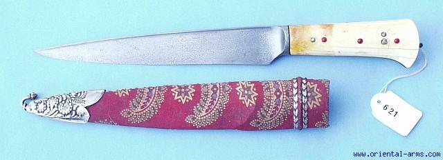 This Indian Kard knife of superb Persian wootz blade is coming right out of our private collection. The blade is 9 inches long, single edge with a very narrow fuller just below the spine. The grips are ivory riveted to the blade tang with three rivets plated with gold and set with six red stones (not glass). The scabbard is recent, covered with red fabric and the scabbard tip is chased silver. Superb piece of wootz steel, probably 18 Century in very good condition. It was re-polished and re-etched to emphasize the blade quality and beauty and upgraded with the red stones at a later date. For the real lovers of wootz steel. |