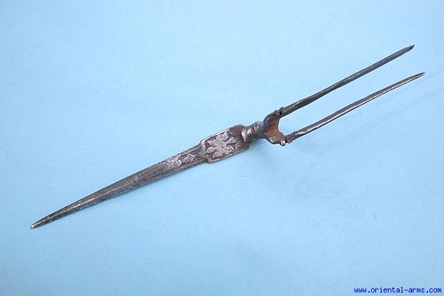 This very rare item is known as Sangin, and it is actually a Bayonet, used in India in the 19 C. It was mounted on the Musket barrel. Blade length 7 inches. Total length 12 inches. Nicely chiseled with a lion head holding the blade in its mouth. Very good condition. Locking rings are missing. Lightly pitted blade. |