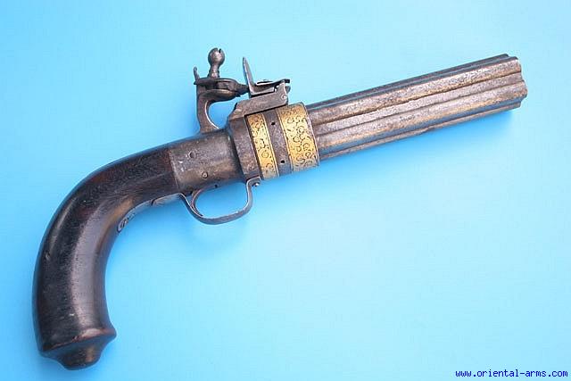 Up for sale is this very interesting Indian version of the European Multi-Barrel Pepperbox pistol. Five rotating barrels 6 ½ inches long. Flintlock mechanism is firing top barrel. The lock is in good working order, with a piece of flint still locked in the hammer jaws. Gold decorated barrel base in a typical Indian 19C. style. Wood butt. Total length 13 inches. Very good condition. An unusual piece in a reasonable price |