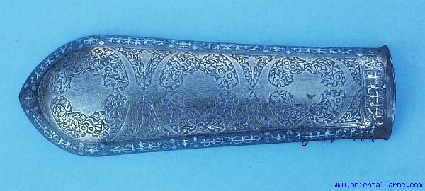 A very interesting and beautiful Indo Persian Bazu-Band (Arm Guard) Beautifully chiseled and inlaid with gold and silver koftgari decoration. More than 12 inches long, 5 inches wide at the widest point. Very good condition, with the internal fabric cushion is partially worn. Very low price . |