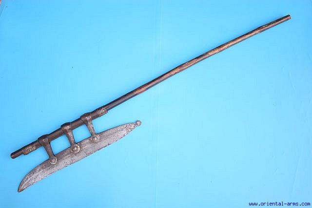 Up for sale this nice probably late 18 to early 19 C. Axe froms south India. It has a 20 inches blade with three sockets secured in place with a steel rod running through the sockets and bound to the haft with steel strips. The wood haft is 47 inches long. Very good condition |