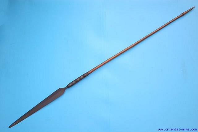 Up for sale a nice old throwing spear. It has a very good 15 inces forged blade with a good old age patina. It has very nice and typical binding of the haft top with braided steel wire. Total length 54 inches. Very good condition.