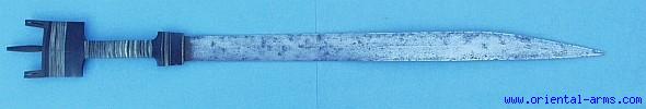 This short sword from Somalia is a development of the Somali Billao dagger and was used mainly by the coastal people of Somalia. It has a long non-symmetrical leaf shape blade, 19 ¾ inches long and of a shallow diamond cross section. The handle is made of several section of dark horn separated by layers of light colored horn. It is a big handle, more than 9 inches long and almost three inches wide. The pommel is of a typical three pronged shape. Very rare. |