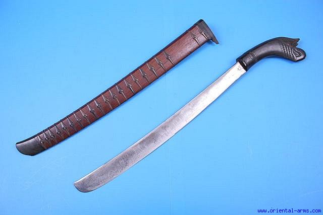 We offer here a nice late 19C - early 20C Golok From Java. deadly sharp blade, meant for business. It has a very good carved horn hilt in a bird head shape. The wood scabbard has two horn mounts with horn belt rings. It is also bound with rare beautiful narrow horn bands. The single edge blade is 16 inches long. Total length 24 inches. |