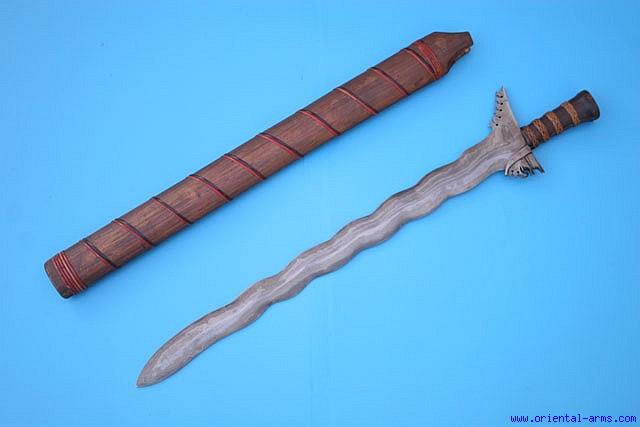 Up for sale is this very good Moro sword. Heavy wavy blade 22 inches long, forged from fine laminated steel with heat hardened edges. Wood handle with braided rattan bands. Steel Baca Baca clamp. Later wood scabbard bound with black and red rattan strips. Total length 27 ½ inches. Very good condition. Several age cracks on the handle but it holds solid. |