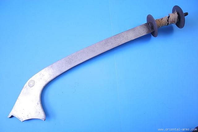 Up for sale is this sacrificial Kora sword of a classical shape and design. The heavy blade is 21 inches long with the very wide 5 inches tip is sharply down curving with the edge of the blade on the concave side. The blade is marked with the “Lucky” talisman sun mark. Handle of tubular grip with disk shaped pommel and cross guard. The grip is covered with its original fabric strip to ensure a good grip. Total length 25 ˝ inches. Very good condition. Grip fabric strip is slightly loose. Very attractive price. |