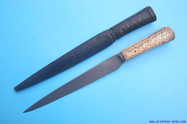 A fine kard knife, mid to late 19 C. most probably of Persian origin. Very good wootz steel blade, 8 ½ inches long. Gilded brass grip strap with carved bone grips. Original leather covered scabbard. Total length 12 inches. Very good condition.