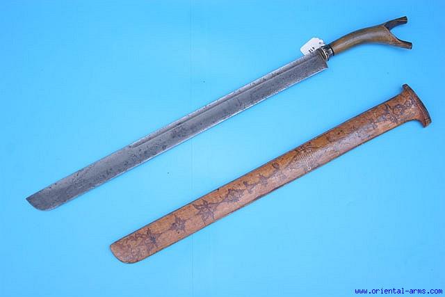 From our private collection, this Sikin is one of the many variations of the Klewang, the Indonesian machete like sword. This one is probably Acheen from Sumatra, mid 19th C. The blade is straight and single edge, 21 inches long with a 14 inches long fuller just below the spine. It is forged from laminated steel. The steel bolster is forged in a polygonal shape. The hilt is carved of horn in a typical forked pommel. The scabbard is made of light color wood decorated with fine drawings. Total length 28 inches. Very good condition. There are few scratches on the blade and minor chips and cracks in the scabbard. A good complete sword at a very low price. |