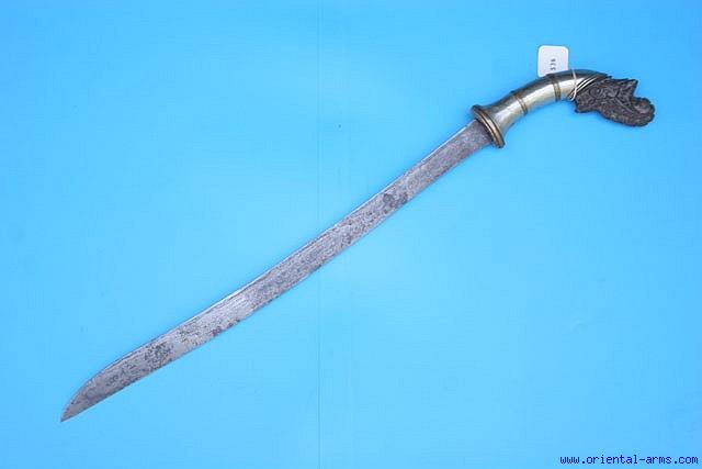 A very nice Parang sword from Indonesia. 19 ½ inches long heavy and thick pamor blade with a beautifully carved horn hilt with white metal collar. 26 inches total length. Very good condition. No scabbard. Very attractive price.
