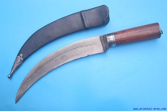 The exact origin and age of this knife is not clear but it is most probably from Rajasthan, India, mid to late 19 C. The 9 inches very heavy blade is forged from very fine laminated steel. It is curved, sharpened on the inner side reminding the sickle shaped Maharta bank dagger. Wood grips and steel bolsters. Total length 13 ½ inches. Very good condition. Newly made scabbard with silver tip. |
