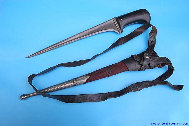 This Karud dagger is the straight back member of the family of the Pesh-Kabz, Choora and Khyber Knife. The whole family of such daggers is common to India, Persia and several Central Asian countries. The blade is forged from beautiful high contrast wootz (Damascus) steel, 12 ½ inches long, heavy, with a pronounced T spine tapering to an acute tip. The grips are Rhino horn cut axially to the horn. This very typical horn grips indicates a Bukhara origin. The grip strap and bolsters are steel. This dagger comes with its original fabric covered scabbard with steel tip and original leather harness and carrying belt. Total length 21 inches. Very good condition. A fine complete piece. |