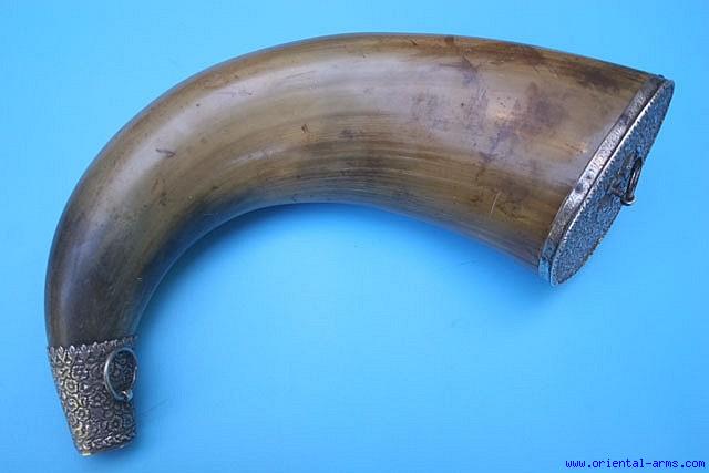 This huge horn is more than 15 inches long, 5 inches wide at the bottom with beautifully chased silver top and bottom covers and silver carrying ring. The chasing style and gods figures on the silver suggest an Indian origin, probably a copy of the European Master Horn containing powder for a whole military unit. An influence of the British military forces in India. Probably early 19 C. Very good condition. The top plug is missing. An absolutely unusual and interesting piece. |