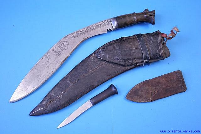 Up for sale is this good Khukuri / Kukri knife, mid to late 19 C. 12 ½ inches heavy blade with ridged spine, engraved on both sides with Nepalese Mythological symbols. Wood handle with steel bolsters and pommel carved in the shape of a lion head. Original leather scabbard with small Karda knife (later) and leather pocket for flint. Original steel tip. Total length 18 ½ inches. Very good condition. Age cracks on the pommel. Small damage to the scabbard. Back pocket slightly loose with recently made leather strip holding it in place. This Khukri is coming from the collection of John Powell, SF, a world known collection of Nepalese and related weapons. |