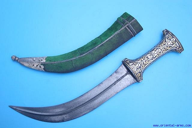 A very interesting and authentic combination of a Jambiya dagger with a Persian wootz blade mounted unto an Indian style handle and with an Indian style scabbard. We believe that this is basically an Indian piece, mid 19 C, incorporating an older Persian blade imported or traded in India. The blade is 9 inches long, forged from very fine high contrast wootz steel. The handle is steel inlaid with gold and silver decoration in the Indian style of the mid 19 C. Wood scabbard covered with green velvet and mounted with engraved and pierced silver tip. Total length 14 inches. Very good condition. Minor blackened areas on the blade. Scabbard fabric worn and repaired in several places. A fine piece. |