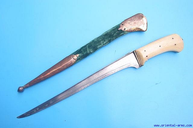 Up for sale is this small Karud dagger from Afghanistan or North India, a family member of the Pesh-Kabz Daggers. The short sturdy blade is 10 ½ inches long, with a strong T spine. The grips are bone and the grip strap and bolsters are brass. This Karud comes with its original scabbard with copper locket and chape, with traces of gilding. Total length 16 inches. Very good condition. Dents on the copper fittings. The green velvet cover is later. |