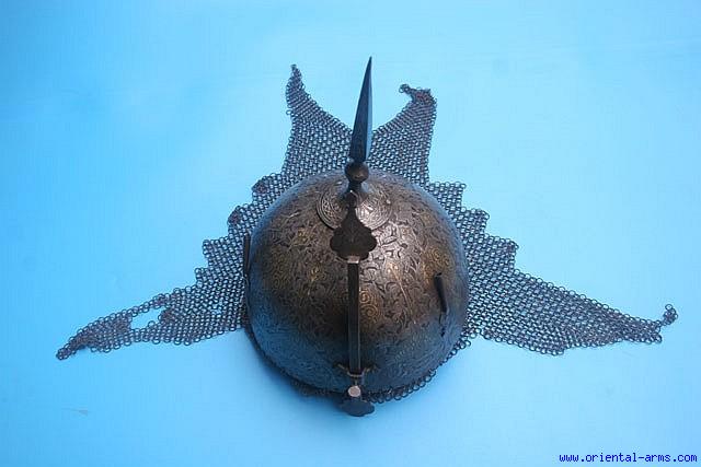 This steel helmet is of Persian origin, Qajar period, second half of the 19 C. probably 1870 or about. The entire surface of the helmet is finely chiseled and inlaid with gold and silver koftgari work. Diameter 7 ½ inches, height 11 inches (helmet bottom to pike tip). Very good condition. Minor losses to the koftgari work and small areas of damage to the mail. Very reasonable price. |