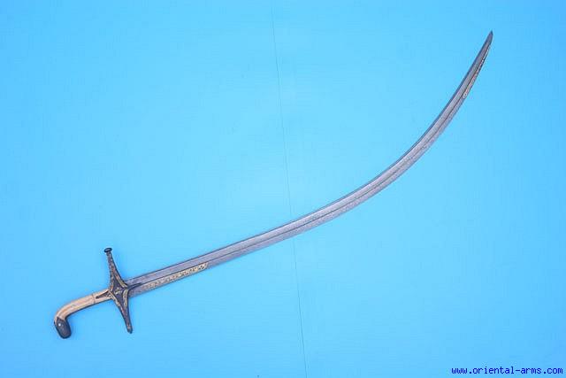 This fine sword has a 32 inches curved blade, forged from very fine high contrast wootz (Damascus) steel but in contrary to the classic Persian Shamshirs, it has a narrow fullered blade. The blade is decorated with gold koftgari work, showing a floral design at the top and a snake image at the bottom. Steel cross guard also decorated with gold koftgari work. Ivory grips with steel grip strap and pommel cap. Total length 37 inches. Very good condition. One of the cross guard tips is damaged. The grips are restored. No scabbard. |
