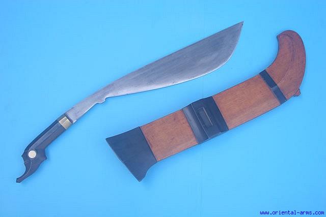 Up for sale is this heavy chopper / machete like blade, possibly from the Mandaya people in the Southern Philippines. Early to mid 20 C. Heavy blade, 18 inches long and 3 inches wide. Hardwood handle with a pommel extrusion reminding this of a Pira sword. Wood scabbard partially painted black. Total length 26 inches. Very good condition. |