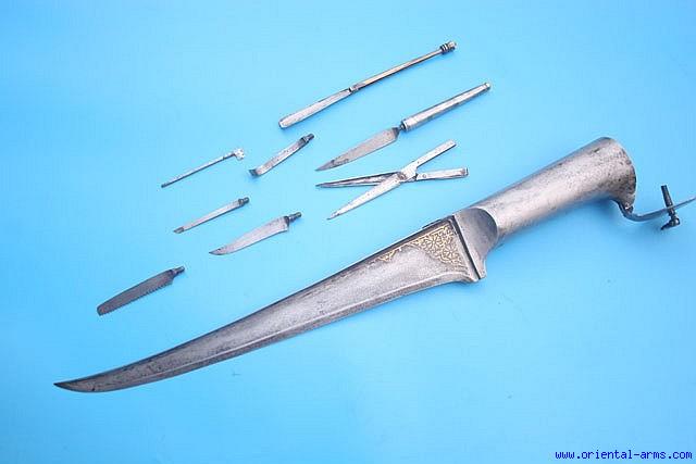 This Unusual knife /dagger is actually an Indian made pesh Kabz made for an handyman ( or a village Physician) and include a et of small tools in the handle compartment. The fine blade is 12 inches long, up-curving with a strong T spine. It is lightly decorated with gold koftgary work. The steel handle is hollow and pommel cover is hinged to reveal a set of small tools, including two fine knife blades, a saw blade, handle for all these, crudely made scissors, a folding razor and several unidentified tools. Total length 17 ½ inches. Very good condition. No scabbard. Few tools are missing. A fine unusual dagger. |