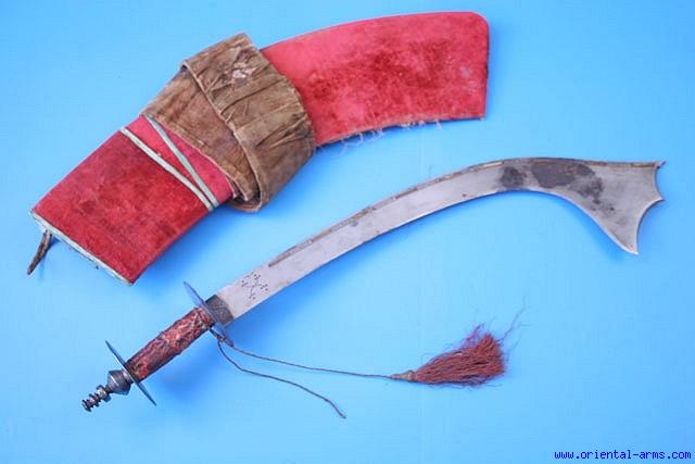 Kora swords were used in Nepal and North India for both fighting and sacrificial processes. They are quite similar, only the sacrificial sword is wider and heavier. This one is a sacrificial Kora and it is constructed to exactly meet this purpose: Heavy, down curving, blade, with its deadly sharp edge on the concave side and with wide heavy tip to provide the weight needed for beheading an animal with one sword stroke. This one has a heavy 20 inches blade, 5 inches max. width, Marked with an Armory (??) marking. The tip is marked with the “sun” talisman marking. The handle is steel bounds with lacquered fibers. This Kora comes with its original velvet bound scabbard and leather belt. Total length 26 ½ inches. Very good condition. Moderately pitted patch on the blade. Scabbard lower seam is open for about 5 inches. Few losses to the velvet cover. This sword is coming from the collection of the Calgary Military Institute, Canada and it is marked with the institute catalog number MI 1830. A rare find. |