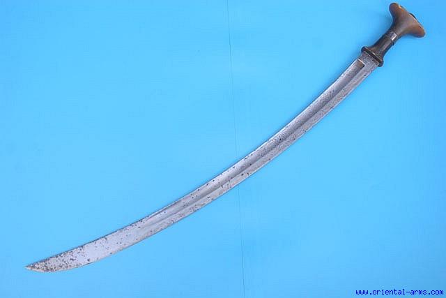 One of the swords made for the Ethiopian army, equipped with a Wilkinson made blade, marked and etched in Amharic. This sword type is known as Gurade ( Saber). Blade length 30 ½ inches, marked by etching with the Wilkinson star and with Amharic inscription and floral design, Handle is carved from a massive piece of honey colored, translucent rhino horn with a central silver band and a beautiful brass pommel cap. Total length 35 inches. Very good condition. Minor chips on the handle. He silver band on the handle may indicate a crack or a breakage of the horn but nothing is evident from the outside. . No scabbard. A fine sword. |