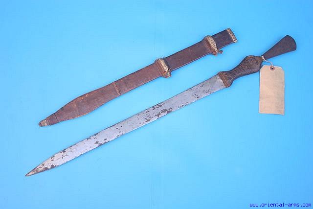 The sword offered here for sale was collected in the battle filed of Omdurman, 1896. It has a flat steel blade 24 ½ inches long, grip bound with braided rattans (or a similar material) and with a long flared pommel. The scabbard is leather in the shape of a classical Kaskara sword from the area. Total length 35 inches. Very good condition. Damaged scabbard tip. The most interesting part of this sword is an old label attached to it and inscribed ( handwriting): Sword found on the field of Omdurman given to me by …..(??). An historically interesting item. |