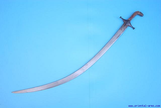 This is a classical Shamshir, with heavy curved Wootz blade 32 ½ inches long and more than ¼ inch thick at its base. Steel cross guard and stag horn grips with steel grip strap and pommel cap. Total length 37 ½ inches. Very good condition. No scabbard. |