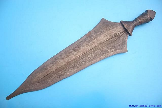 In the heart of the African rain forest, near Stanley Falls the Tetela people are using a very peculiar knife / short sword. It is characterized by a Diamond shaped, big and heavy steel pommel. The purpose of this heavy pommel (some time as heavy as four pounds) is not clear. Some people say it was supposed to be used as a drop knife from the height of a tree (A very complicated task in the dense vegetation of the rain forest), other say it is meant to increase the blow of the blade. It is most probably a sign of wealthy and power that was developed during years from a smaller pommel, and reached super non-practical sizes when firearms replaced blades in Africa. This one is a nice exemplar, 14 inches long blade delicately incised with straight lines design and scratched in a decorative pattern. Wood hilt bound with copper strips and with a steel pommel. Total length 18 inches. Very good condition. Minor edge nicks. Few binding in lower part of the handle are missing. Minor hairline cracks in the handle wood. No scabbard. |