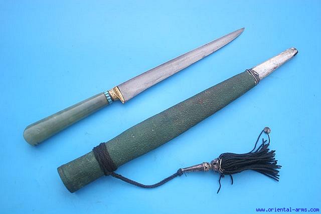This is very fine Kard knife, probably from Bukhara. The blade, 7 ½ inches long, is elegantly forged from very fine Persian Wootz steel, of clear pattern and contrast with a T shaped spine. Gold bolsters. Jade handle with turquoise stones set all around the grip collar. This dagger comes with its original green leather scabbard with silver tip bound with black thread with silver mounted tip. Total length 13 ½ inches. Very good condition. Minor blackened spots on the blade. three turquoise stones are missing. The scabbard stitching is later. |