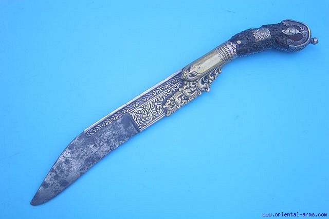 Up for sale is this very fine “PIHA KAHETTA”, the traditional knife of the Sinhalese from Sri-Lanka (Ceylon). Like the old classical examples it has a single edged short heavy down curving blade, 7 inches long but only 4 ˝ inches has an edge. The rest is covered with very fine chiseled brass and chased silver bolsters. The grips are beautifully carved from ivory with deep almost black shiny patina, set with chiseled and chased silver plaques and pommel cover. Total length is 11 inches. Very good condition. Very fine patina on the blade and the ivory grips. A fine piece in good condition and very reasonable price. |