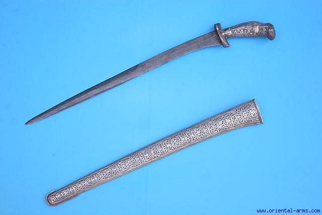 The Pedang Lurus is an Indonesian short sword, common in Java but can be found also in other Indonesian islands. The blade is 17 slightly down curving tip and with 10 inches back edge. It is forged from very fine pamor steel deeply etched and clearly seen on all blades surfaces. The hilt is worked in heavy silver in an elaborate design. The scabbard is wood covered with silver sheet chased in a very intricate design. Total length 21. inches. Very good condition. Minor edge nicks Very Fine item, dated probably to the second half of the 19 C all original pieces |