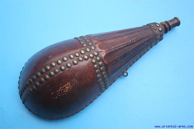 Up for sale, is this very fine and elegant, 19 C., Moroccan powder flask. The wood body is in a shape of turtle covered with brown leather and decorated with brass tacks. The mouth is nicely carved horn. It is quite large flask 12 inches long and 4 1/2 inches wide. Very good condition |