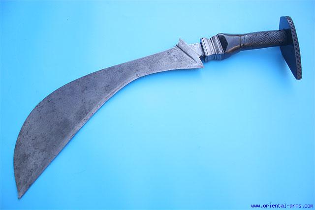 The Ayda Katti is the national sword of the Coorg of Malabar, the South West coastal area of India. It is one of the rarest swords in the Indian arsenal and of a very peculiar shape. It reminds in a way an agricultural tool, but it is a real weapon and a deadly one in the experienced hands. The blade of this one is of a sickle shape 16 1/2 inches long and 4 inches wide at its widest point. The handle is carved horn checkered around the grips area, with a kite shaped horn pommel. 22 inches total length. Very good condition. A RARE UNIQUE SWORD. |