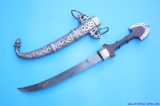 The Moroccan version of the Arab Jambiya dagger is locally called Koumaya and characterized by a slender blade, usually dual edged at its lower half and single edge at the top. There is a big variety in the decoration styles and quality of the handles and scabbards. This one is circa 1900, of a good quality, with a 9 1/2 inches blade, fine brass scabbard with finely pierced and engraved silver front. The hilt of carved wood with chased and engraved silver fittings, painted red (partially erased). Total length 15 1/2 inches. Very good condition. |