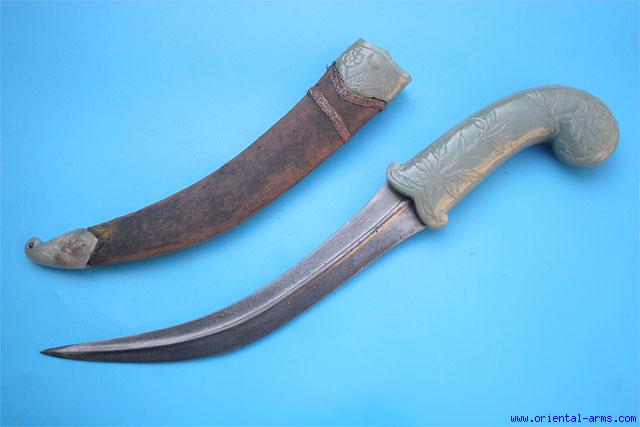 This is the style of Indian daggers from the Mogul period, probably late 18 to early 19 C, mostly sought after. Blade 9 inches long, forged of very fine wootz (Damascus steel), curved and double edges with central rib, of clear Persian influence. Handle and scabbard locket and chape are carved from fine jade, of light green shade. The chape is set with two red stones (Garnets ??). Scabbard made of wood covered with the original green velvet. Total length 14 1/2 inches. Very good condition. Red stones are later. Velvet partially worn. A very fine and rare piece. |