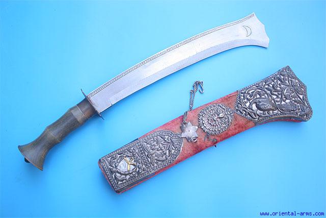 A fine and real sacrificial Kora short sword Circa 1950, used to behead small animals and birds for sacrificial purposes. The heavy blade is 12 inches long, deadly sharp. The handles is horn. This Kora comes in its original carrying box, cushioned with red velvet, locked with small silver hooks on silver chains and set with finely chased and pierced silver mounts. Total length 17 1/2 inches. Next to mint condition. It is interesting to note the two crossed gold Khukuri shapes on the locket, indicating the Nepalese origin of this item and possibly indicate that this item is a real presentation piece. |