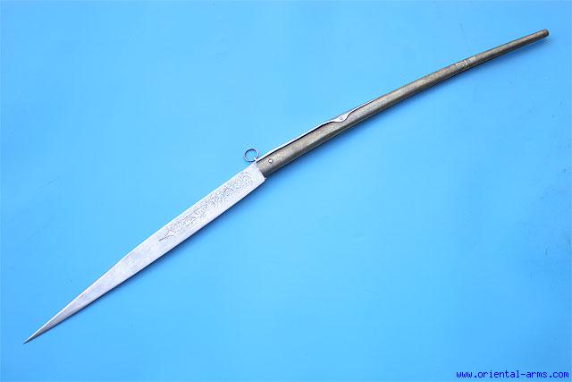 Up for sale is this huge size Spanish folding knife known also as Navaja . This type of knives was used extensively in Spain during the 18 and 19 Centuries to cut food as well as to settle personal accounts, and found as a man best companion still today. This one is of very big and unusual dimensions: “Only” 33 inches fully opened, 17 1/2 inches in closed position. The blade is 15 ˝ inches long crudely engraved with a simple floral design and inscribed: Fabrico de Toledo, Anno de 1891 . The grips are engraved brass. Very good condition. |