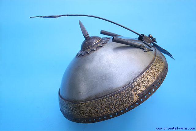Up for sale is this very unusual Indian helmet, probably late 18 C. The steel dome is 4 inches tall ending with gold decorated rosette and a 1 inch spike. A steel strip with gold inlay, probably taken from an earlier helmet is riveted all around the rim. The nasal protector is held in position with a small hook ( and not with a small screw as common in later helmets) and is all inlaid with gold koftgari work. Very good condition. The feather holders and nasal protector bridge are restored. Very attractive price. |