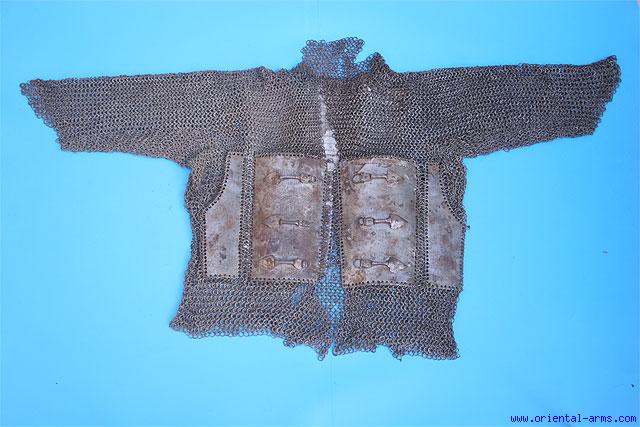 We offer for sale this late 17 to early 18 C. mail and plates armor shirt from India, composed of many thousands of separate rings each one interlaced with four other rings and each one individually riveted. This shirt was made for a rather small guy: 25 inches tall and 44 inches wide with sleeves fully stretched. The shirt has two chest plates with buckles in each, four side plates and three rows of scales on the back. The right breast plate is inscribed both outside and inside with Arabic as well as hindu letters, suggesting that this armor change hands during the many battles taken place in India in the 17 and 18 C. Very good condition. Very few missing rings. Some old repairs on the plates on the inner side. A rare piece in good condition. |