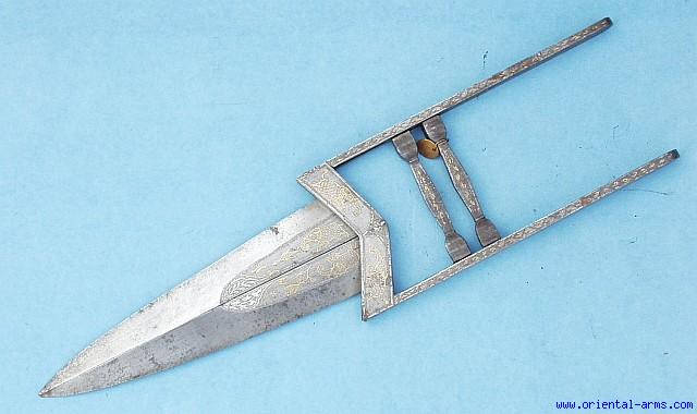 Here is one of the interesting variations of the Kattar , the famous Hindu push dagger. This one is known in India as: Jamadhar Sehlikaneh or literally: having three blades. In the western world it is known as Scissors Kattar. When the grip’s cross bars are squeezed together, the outer blade opens to reveal an internal additional blade. This specific item is having a blade of 8 inches and both the blades and the handle parts are decorated in gold koftgary with animals of hunting: Elephants, tigers, antelopes and the like. Very good plus condition, only minor freedom of the main axes on which the blades are open. This is a very nice example of this family of Kattars. It is probably early 19 C. whereas most of these Kattars on the market are dated to the early – middle 20th Century. |