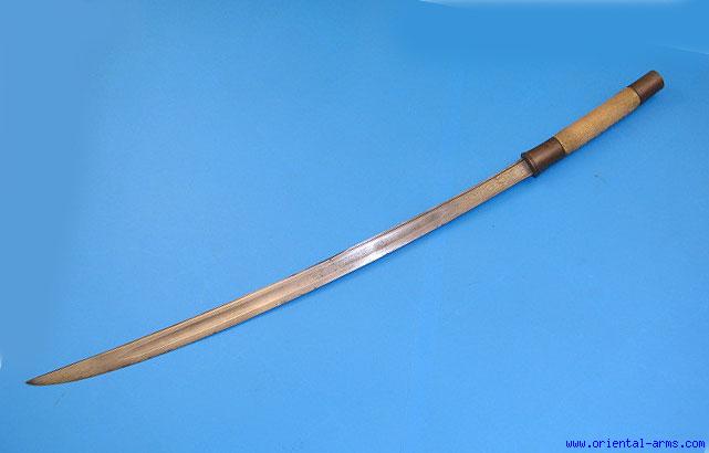 Up for sale is this nice Dah Sword, With a slightly curved blade 28 inches long with central groove inlaid at its base with fine brass inlay in floral design. The brass mounted hilt is coverd with ray skin. Total length is 36 inches. Very good condition.