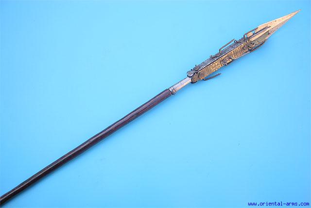 We are not at all sure that this is Indian. It is surely very unusual. The 5 1/2 inches steel blade is screwed on to a long steel socket, and over it there is an unclear brass and iron structure, nicely stamped with geometrical motives and with small brass and steel spikes riveted to it. It can be removed by un-screwing the blade from its socket. Probably a ceremonial addition to a long spear. Long wood haft. Total length 67 inches. Very good condition. Good age patina on the wood haft. An unusual item. |